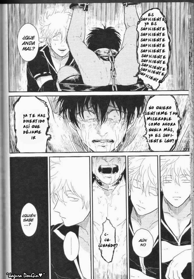 Pondré un ejemplo ya para acabar usando el dj de Gintama (uno de muchos) llamado Mienai Kusari. En él uno de los personajes es secuestrado y recluido en una habitación solitaria donde solo tiene la compañía de su abusivo captor, que lo visita solo para hacer uso de él como si fuese un objeto. Durante su estadía ahí podemos ver como la víctima atraviesa diferentes estados de ánimo que pasan por la sumisión iniciándose en la confusión y la ira y terminando en la desesperación. La víctima, acostumbrada a una rutina en la que se aburre y se siente solo hasta que el captor llega, termina asimilando este estilo de vida hasta el punto en que, sin el captor, la soledad le abruma tanto que acaba buscándolo, llamándolo. Desarrolla una enfermiza, pero realista, dependencia emocional hacia la única persona a la que ve mientras está ahí encerrado. Además, cuando Harada dibuja los actos horribles que el captor hace y disfruta, no nos miente sobre cómo se siente la víctima y para explicarlo mejor dejaré una imágen que creo que lo ilustra a la perfección y que cerrará esta recomendación:
